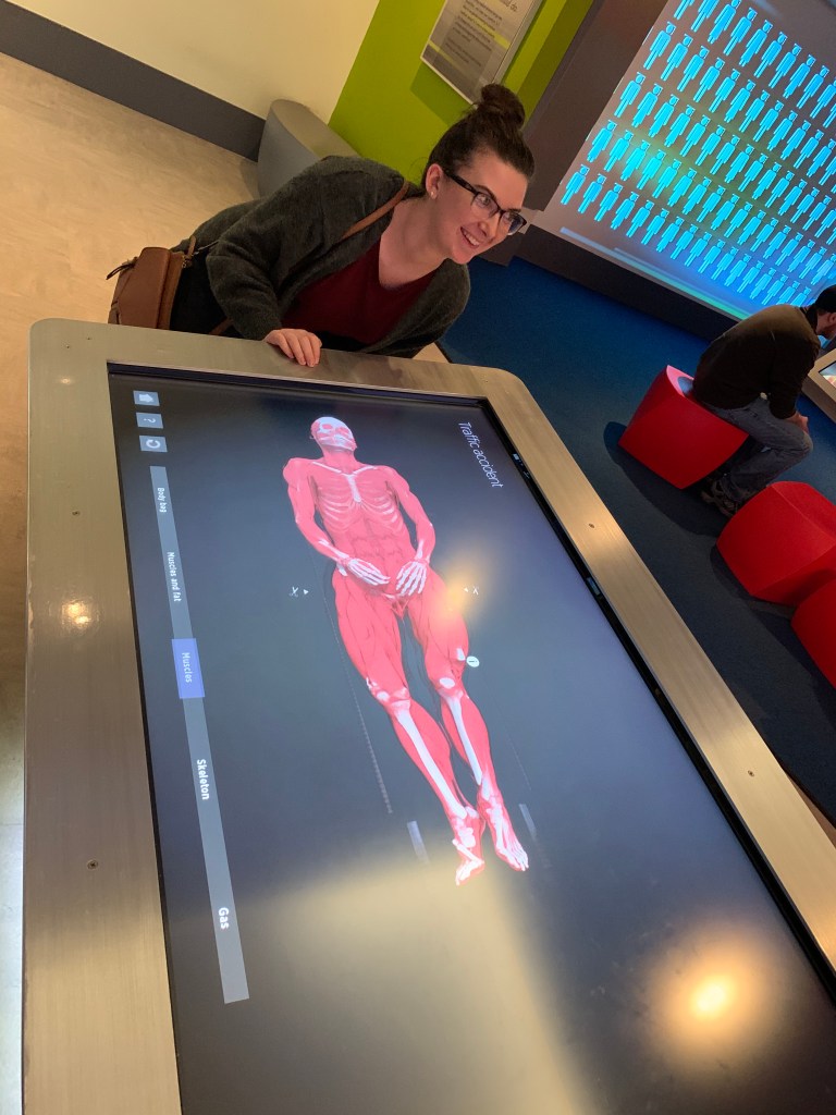 This weekend a large group from our MST program here at WIU went on a bus trip to the Museum of Science and Industry in Chicago. While at the museum we witnessed a lot of new and interesting tech that the museum has implemented into their exhibit space. The piece of tech that caught my attention was located on the third floor of the museum in the You! The Experience exhibit. Tucked into a room away from the main exhibit rested an oversized touch screen (think large Ipad) that was over 5 feet long by 2 feet long. This exhibit was called “Trauma: Inside the Human Body” and was installed in the museum at the end of 2019. This exhibit did not have any physical objects going with it – the entire exhibit was this interactive screen of which you could change what was being displayed. The purpose of the exhibit was for visitors to see the aftermath of the human body after going through traumatic events. There were four different scenarios to choose from: a traffic accident, a seizure, a brain aneurysm, and someone who had died due to old age. All of the different scenarios were fatal to the human. After choosing your scenario the visitor has a multitude of different things they can do. The visitor can zoom in, crop, remove layers of the body (down to the tissue or veins), and see a recreation of the body going through the scenario. The interactive allows the visitor exactly what happens to almost all portions of the body when going through a traumatic event (such as a car accident). This tech was particularly interesting to me because I had never seen an exhibit that allowed the visitor to go through, frame by frame, what happened to the deceased body as they were in a traffic accident. You could literally see the various broken bones, broken tissue, and torn muscle of the individual as if you had a real time special x-ray machine. This exhibit took an “Ipad level” interactive to a new level for me as this gave such immense detail that was not available in any other touch screen interactive I have seen before. If I had to describe this exhibit to someone who has not seen it before I would describe it as “If you were witnessing the car accident and the immediately seeing detailed autopsy photos and findings.” Overall, this piece of tech was very advanced and was pushing the boundaries of what we know as the classic touch screen interactive within museums.